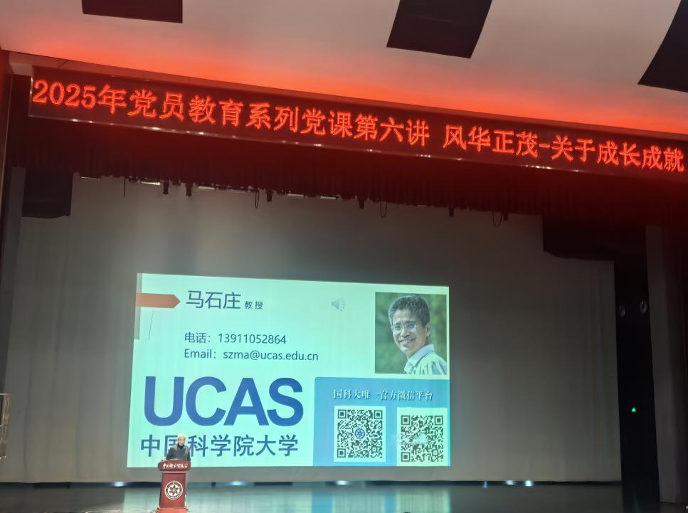 为深入学习贯彻习近平新时代中国特色社会主义思想,加强党员理想信念教育,引导青年党员树立正确成长观念、成就观念,中国科学院大学材料光电未来技术学院党委、地星学院党委、计算机网安密码学院党委、电子集成电路学院党委、化学化工纳米学院党委、生命学院党委联合举办2025年党员教育系列党课活动,邀请我校马石庄教授进行多次授课。2025年11月23日,马石庄教授主讲的党员教育系列党课第六讲——“风华正茂:关于成长成就”在雁栖湖东校区礼堂正式开场,现场气氛热烈,互动频繁。